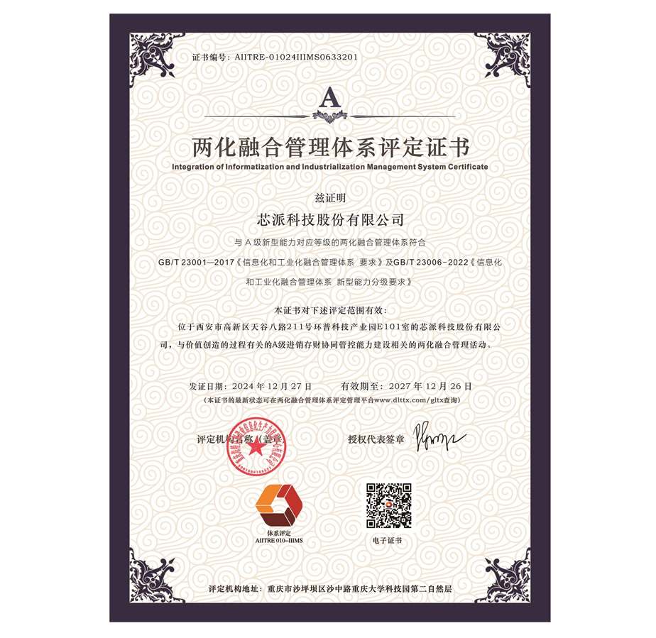 芯派科技積極響應國家關(guān)于推動兩化深度融合的號召,以“綜合提升、智能發(fā)展、追求卓越、持續(xù)發(fā)展”為兩化融合工作方針,通過成立兩化融合領(lǐng)導小組、編制發(fā)布體系文件、體系試運行等一系列扎實有效的工作,在體系建設過程中不斷優(yōu)化業(yè)務流程、升級信息化系統(tǒng),將公司訂單、銷售、發(fā)貨與財務等信息進行有效整合,實現(xiàn)降本增效、快速反應、精細管控的目標,最終順利通過體系認證。