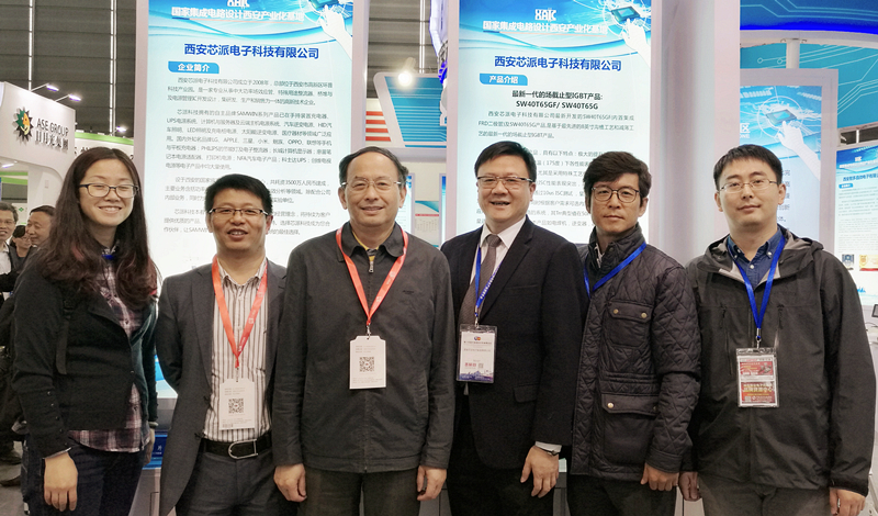 陜西省半導(dǎo)體行業(yè)協(xié)會(huì)理事長(zhǎng)邱義路先生(左三)、秘書(shū)長(zhǎng)何曉寧先生(左二)光臨芯派展臺(tái)并與芯派科技總裁羅義先生(左四)合影
