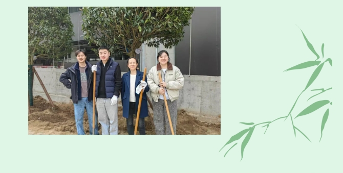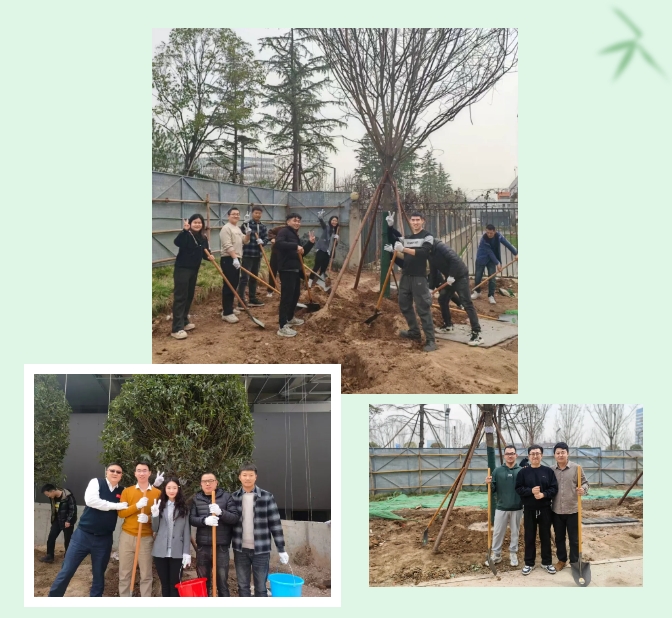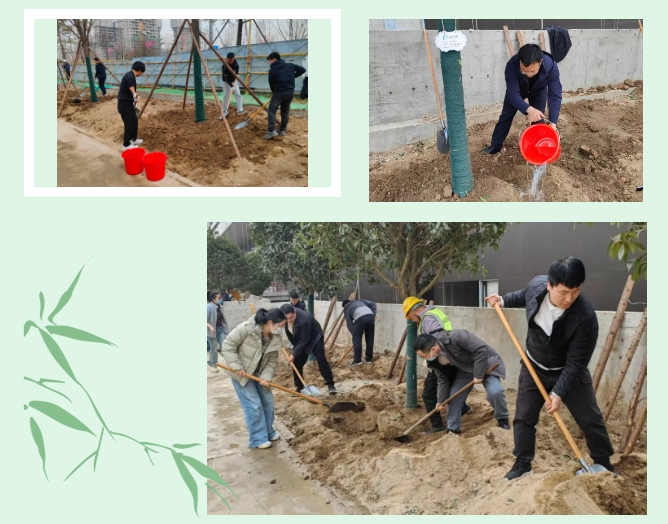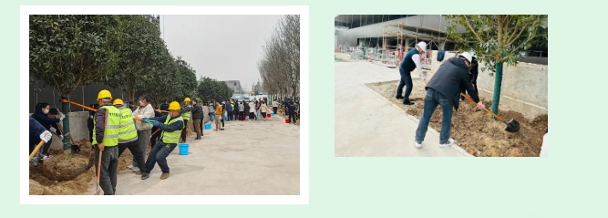 參觀結(jié)束后,大家領(lǐng)取工具、分組協(xié)作,在園區(qū)景觀帶栽種?國(guó)槐、金桂?。各小組揮鍬破土、扶苗填坑、培土澆水,每一棵樹苗的扎根都凝聚著團(tuán)隊(duì)力量?。