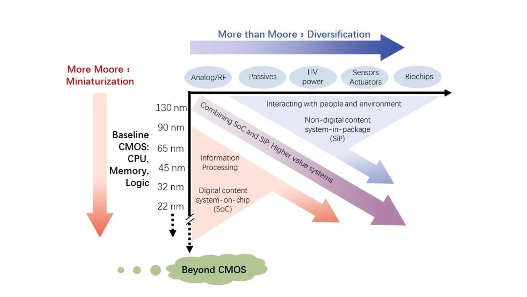 幸運的是,每當(dāng)摩爾定律被唱衰將走到盡頭,總會激發(fā)出科學(xué)家和工程師們創(chuàng)新構(gòu)想,提出力挽狂瀾的突破性技術(shù),將看似走向終結(jié)的摩爾定律以“后摩爾定律”的形式延續(xù)下去。“后摩爾定律”的實質(zhì)是,它除了會延續(xù)摩爾定律對集成度、性能的追求外,還會利用更多的技術(shù),例如模擬/射頻、高壓功率電源、MEMS傳感器、生物芯片技術(shù)及系統(tǒng)級封裝(SiP)等三維集成技術(shù),以提供具有更高附加值的系統(tǒng)。