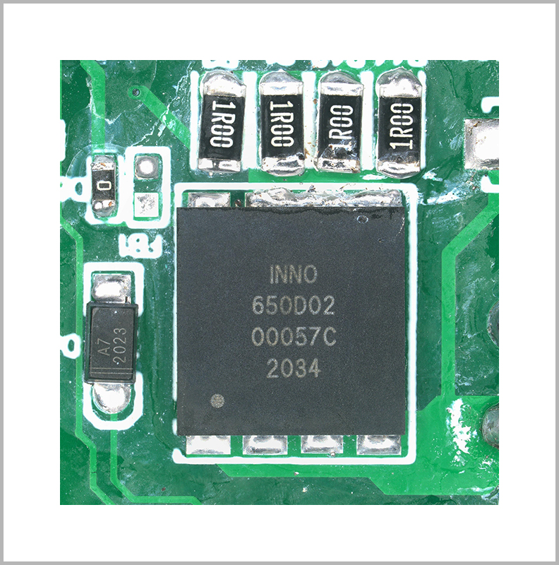 該適配器DEMO主功率開(kāi)關(guān)器件來(lái)自國(guó)內(nèi)GaN器件龍頭企業(yè)“英諾賽科科技有限公司”,型號(hào)為INN650D02,INN650D02是一顆經(jīng)過(guò)市場(chǎng)驗(yàn)證的可靠性極高的GaN器件,內(nèi)阻僅為200mΩ,其封裝為DFN8*8,是英諾賽科針對(duì)PD市場(chǎng)推出的GaN器件。該器件同時(shí)還在努比亞65W USB PD氘鋒氮化鎵快速充電器、飛頻65W USB PD氮化鎵充電器、魅族65W氮化鎵充電器、ROCK 65W 2C1A氮化鎵快充充電器等多款PD產(chǎn)品采用。