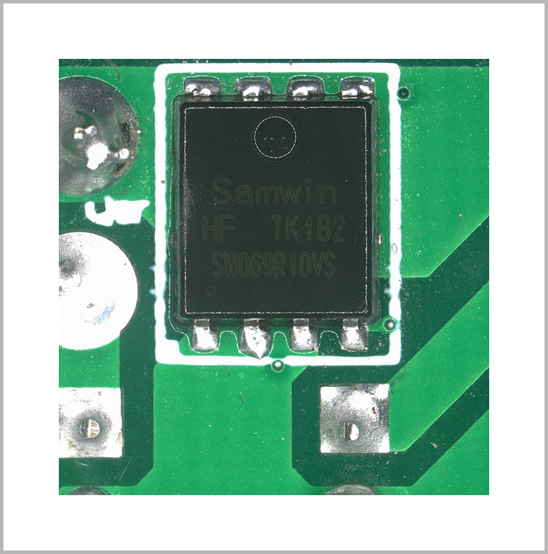 該適配器DEMO板上的同步整流MOSFET采用了“西安芯派電子科技有限公司”的 SW069R10VS, SW069R10VS是一顆SGT 工藝的低壓MOSFET ,其內(nèi)阻為7.1mΩ,耐壓為100V,開(kāi)關(guān)損耗小,導(dǎo)通內(nèi)阻低,可以有效的提升PD適配器的效率,是芯派科技專(zhuān)門(mén)針對(duì)PD方向應(yīng)用推出的一顆SGT低壓MOSFET,其規(guī)格參數(shù)入下圖所示。