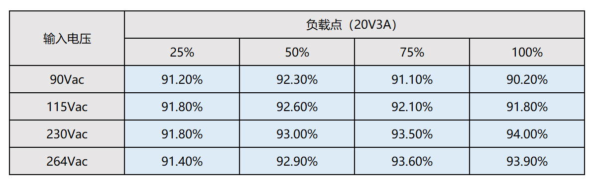 通過(guò)對(duì)該DEMO板的測(cè)試,發(fā)現(xiàn)其滿載最優(yōu)效率點(diǎn)出現(xiàn)在230V輸入,20V滿載輸出時(shí),其最優(yōu)效率為94%。滿載最差效率點(diǎn)出現(xiàn)在264V輸入,5V滿載輸出時(shí),效率為89.3%。整個(gè)適配器在全電壓輸入、全負(fù)載輸出段效率一致性較高,綜合性能極優(yōu)。
