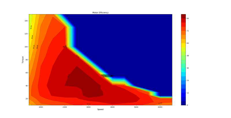 電力驅(qū)動(dòng)系統(tǒng)是電動(dòng)車(chē)的心臟,其性能的優(yōu)劣會(huì)直接影響電動(dòng)車(chē)的整車(chē)性能,內(nèi)置式電驅(qū)系統(tǒng)功率密度大,驅(qū)動(dòng)效率高。高效的MAP圖對(duì)樣機(jī)的設(shè)計(jì)及整車(chē)的性能分析提供了數(shù)據(jù),通過(guò)電機(jī)的外特性及負(fù)荷特性的測(cè)試數(shù)據(jù),會(huì)自動(dòng)生成效率MAP圖。