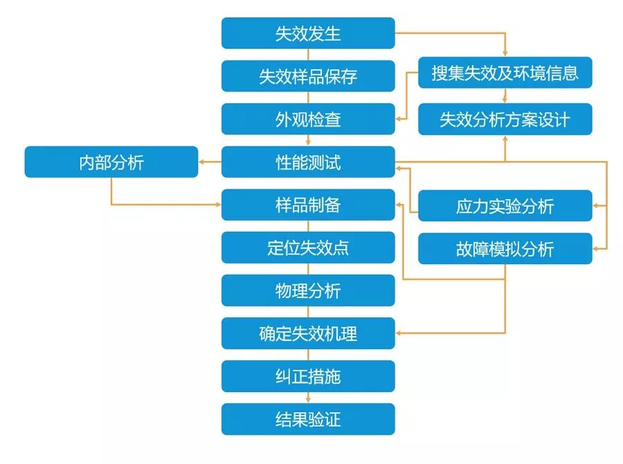失效分析的原則是先進(jìn)行非破壞性分析,后進(jìn)行破壞性分析;先外部分析,后內(nèi)部(解剖)分析;先調(diào)查了解與失效的有關(guān)情況(電路、應(yīng)力環(huán)境條件、失效現(xiàn)象),后分析失效元器件。失效分析流程圖如下圖所示。